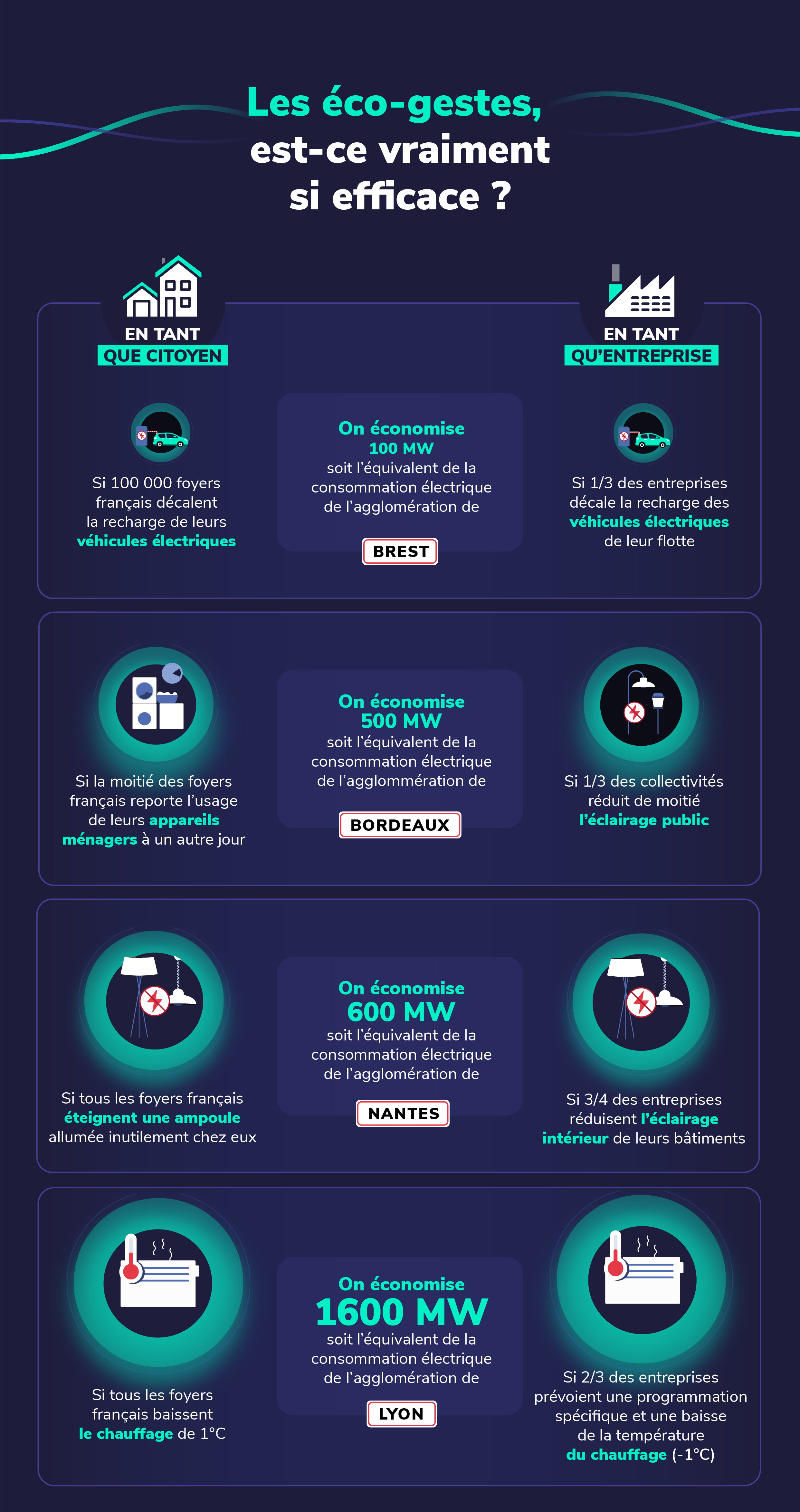 En hiver, la consommation d’électricité est importante. Pour sécuriser l’approvisionnement de tous les Français en électricité et éviter les coupures, les entreprises, les collectivités et les citoyens sont encouragés à s’informer sur la situation du réseau électrique et à appliquer les bons gestes au bon moment. C’est facile avec Écowatt !