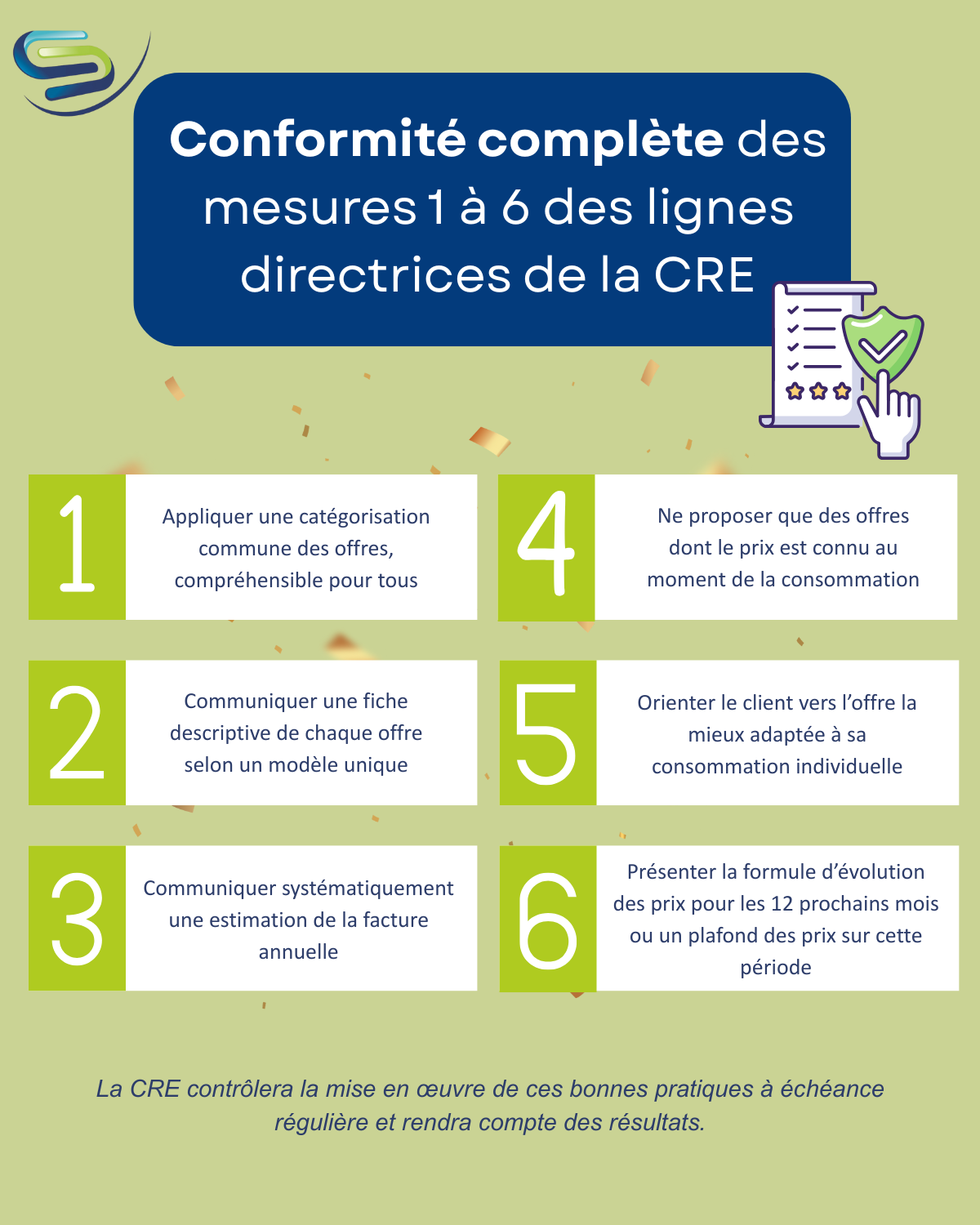 Nous sommes fiers d’être en conformité complète sur les 6 premières mesures des lignes directrices de la CRE.